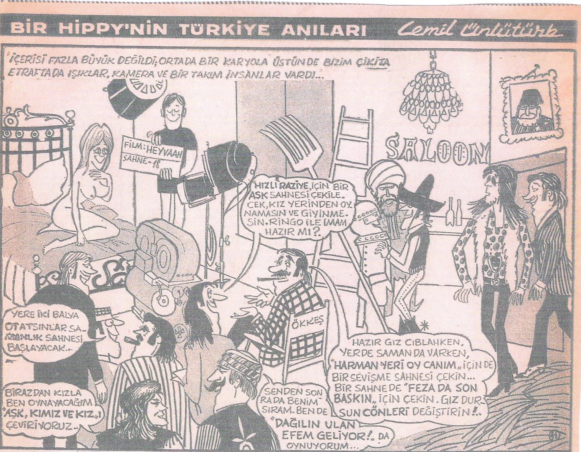 “İngiltere ye gideceğim diye güzel bir elbise diktirdim, klasik İngiliz modeli. Gittim, ülkede hippi modası var… Benim İngiltere ye gelişim buradaki şaşkınlığım ve dönüşümde benim de uzun saçlı bir hippi oluşumu anlattığım bir karikatür çizdim, Evening News adlı gazeteye gönderdim. İlgi gösterdiler ve hatta benimle de bir röportaj da yaptılar ve tam sayfa da yayınladılar.